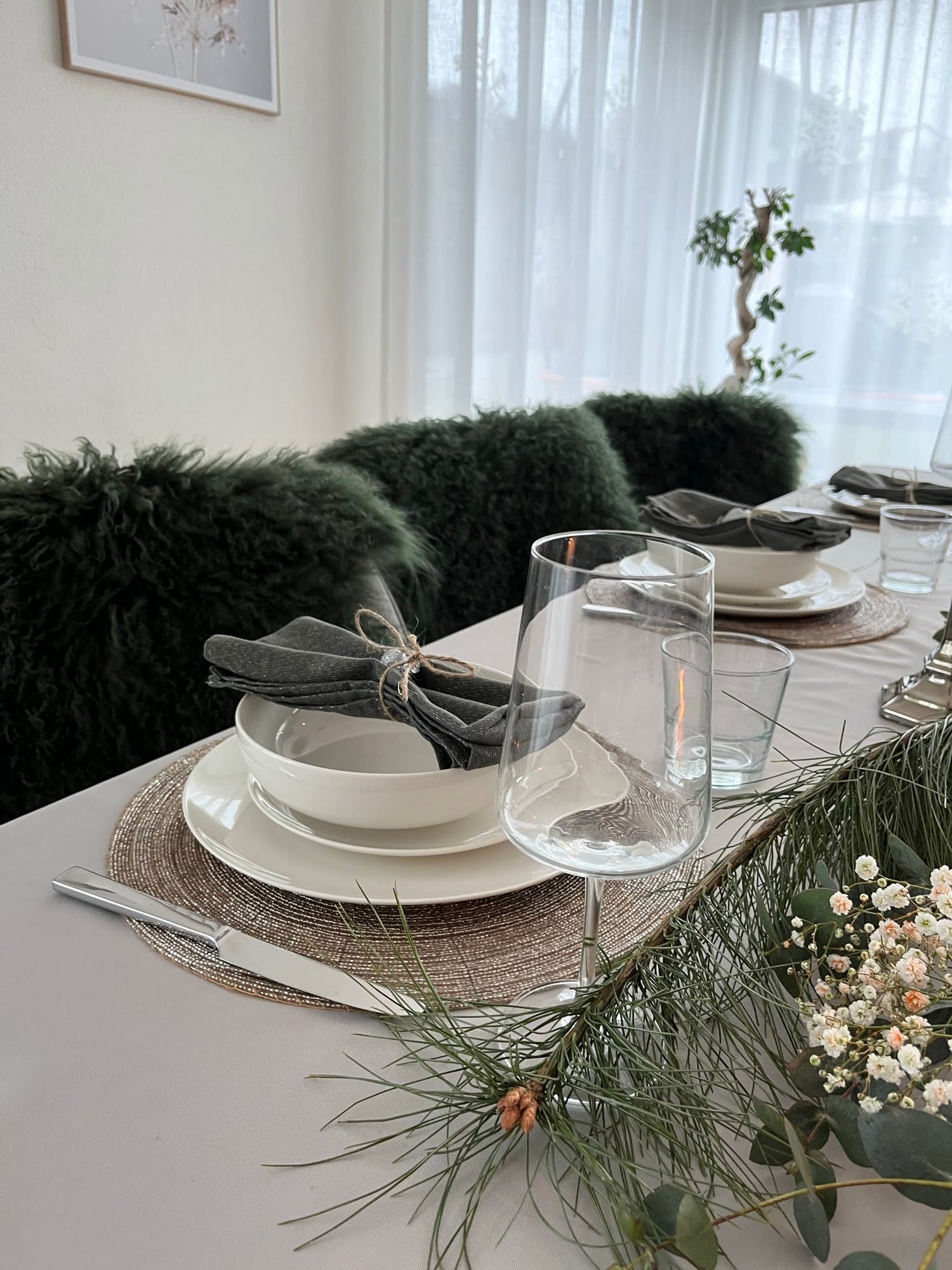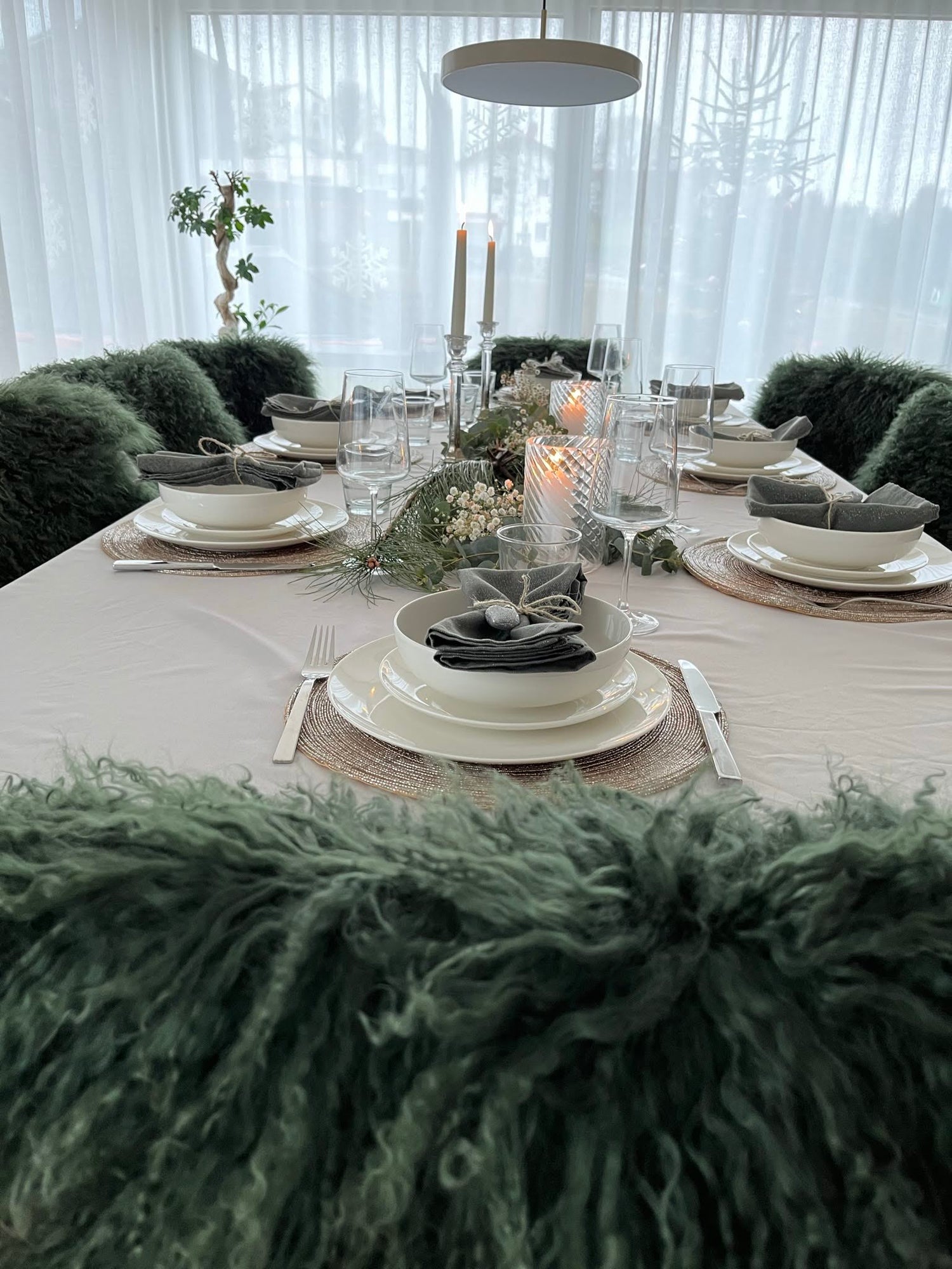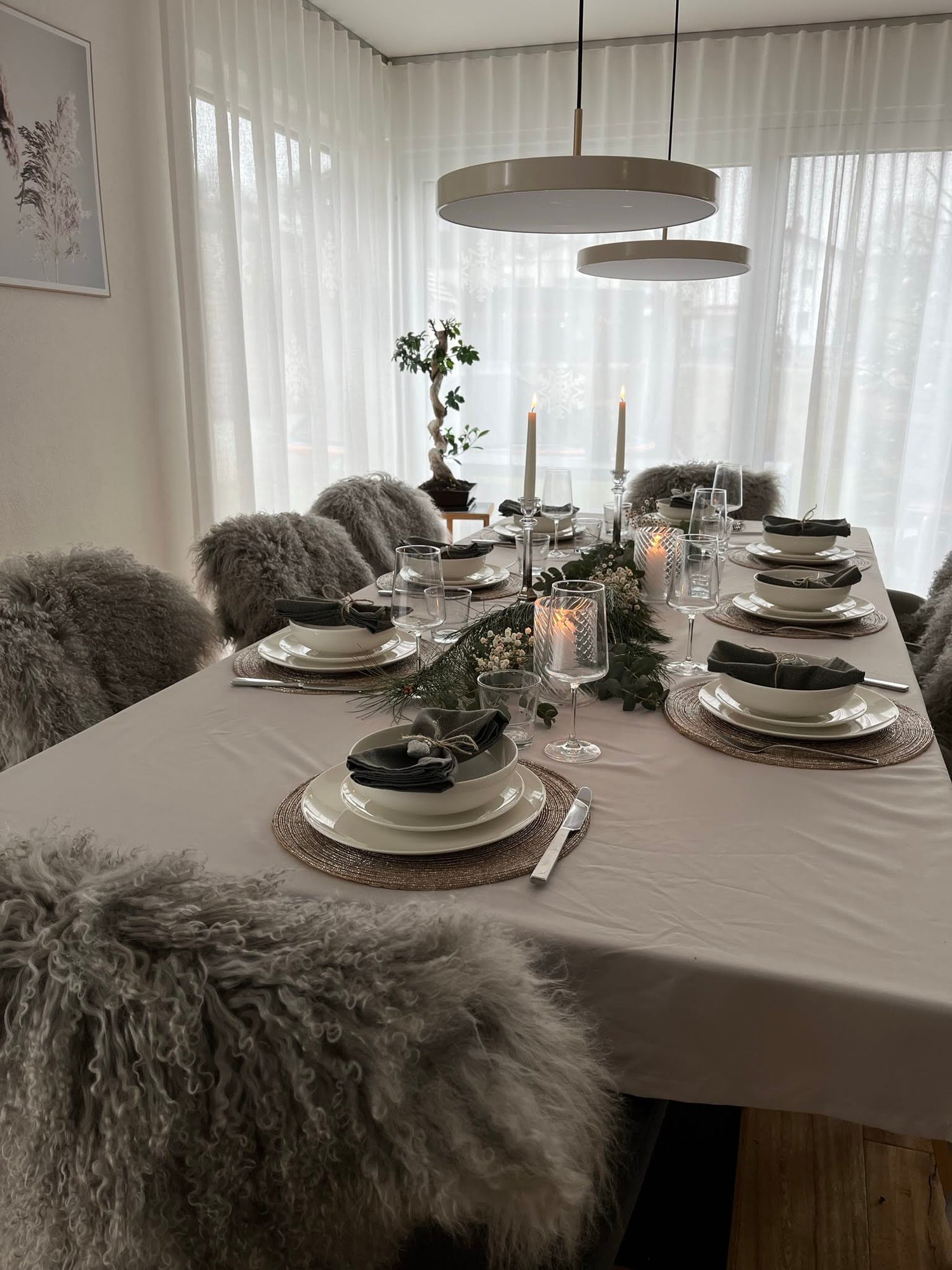 Ein liebevoll eingerichtetes Esszimmer mit natürlichen Materialien wie Lammfell, Holz und Leinen schafft eine Atmosphäre voller Wärme und Geborgenheit. Die Kombination aus Funktionalität und Stil macht den Raum zum Lieblingsort für gemeinsame Stunden. Mit durchdachter Tischdekoration, gemütlichen Sitzkissen und sorgfältig ausgewählten Wohnaccessoires wird Ihr Esszimmer zur Wohlfühloase, in der sich jeder willkommen fühlt.