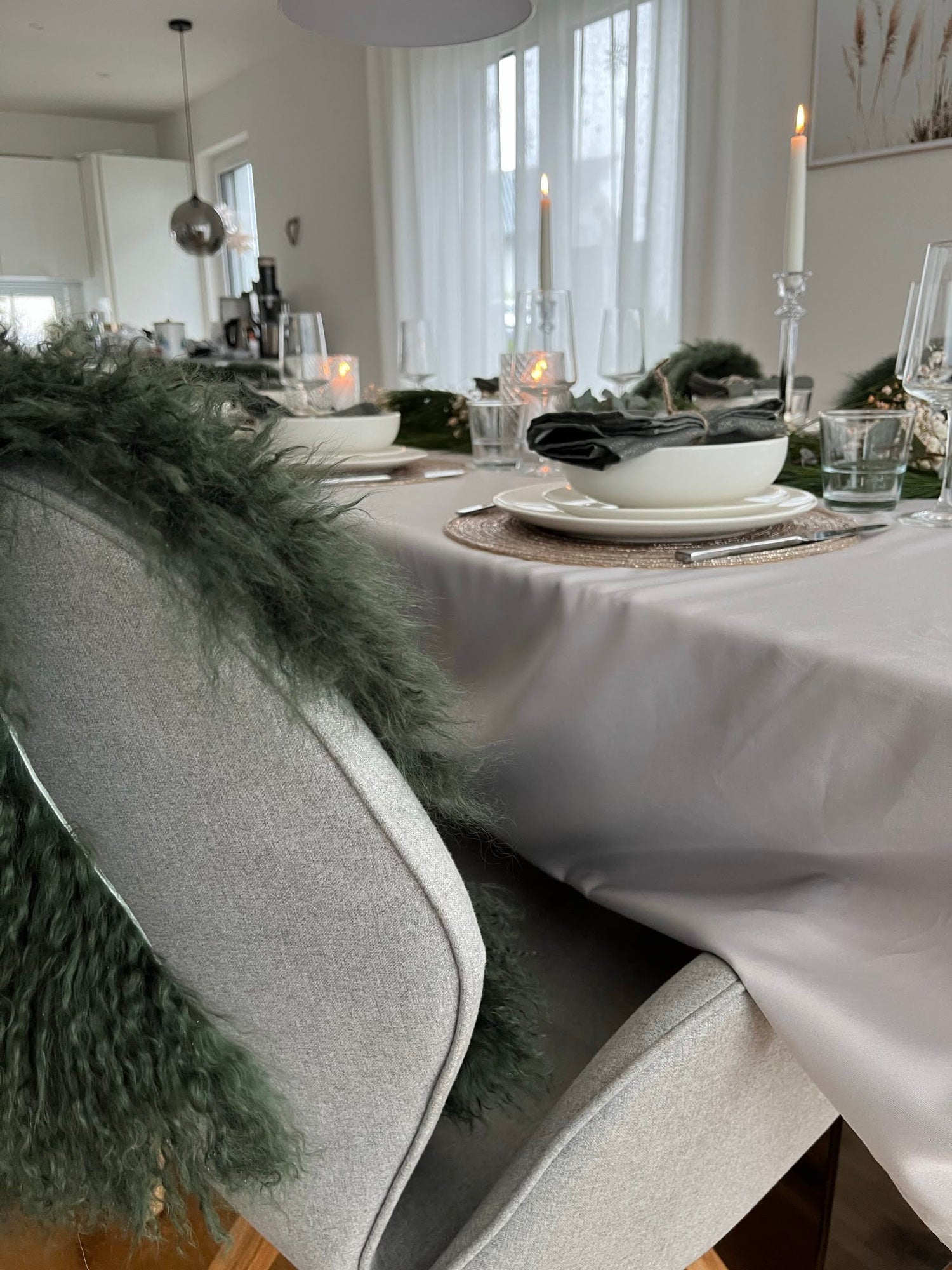Holz ist der Klassiker im Esszimmer und verleiht jedem Raum eine warme, natürliche Basis. Ergänzt man diesen mit weiteren natürlichen Materialien wie Lammfell, Leinen, Wolle und Baumwolle, entsteht ein harmonisches Zusammenspiel aus Textur und Farbe. Besonders Lammfellkissen oder Sitzauflagen aus echtem Fell bieten nicht nur optisch, sondern auch haptisch ein angenehmes Erlebnis. Sie bringen nicht nur Wärme, sondern auch einen luxuriösen und zugleich rustikalen Charakter an den Esstisch.