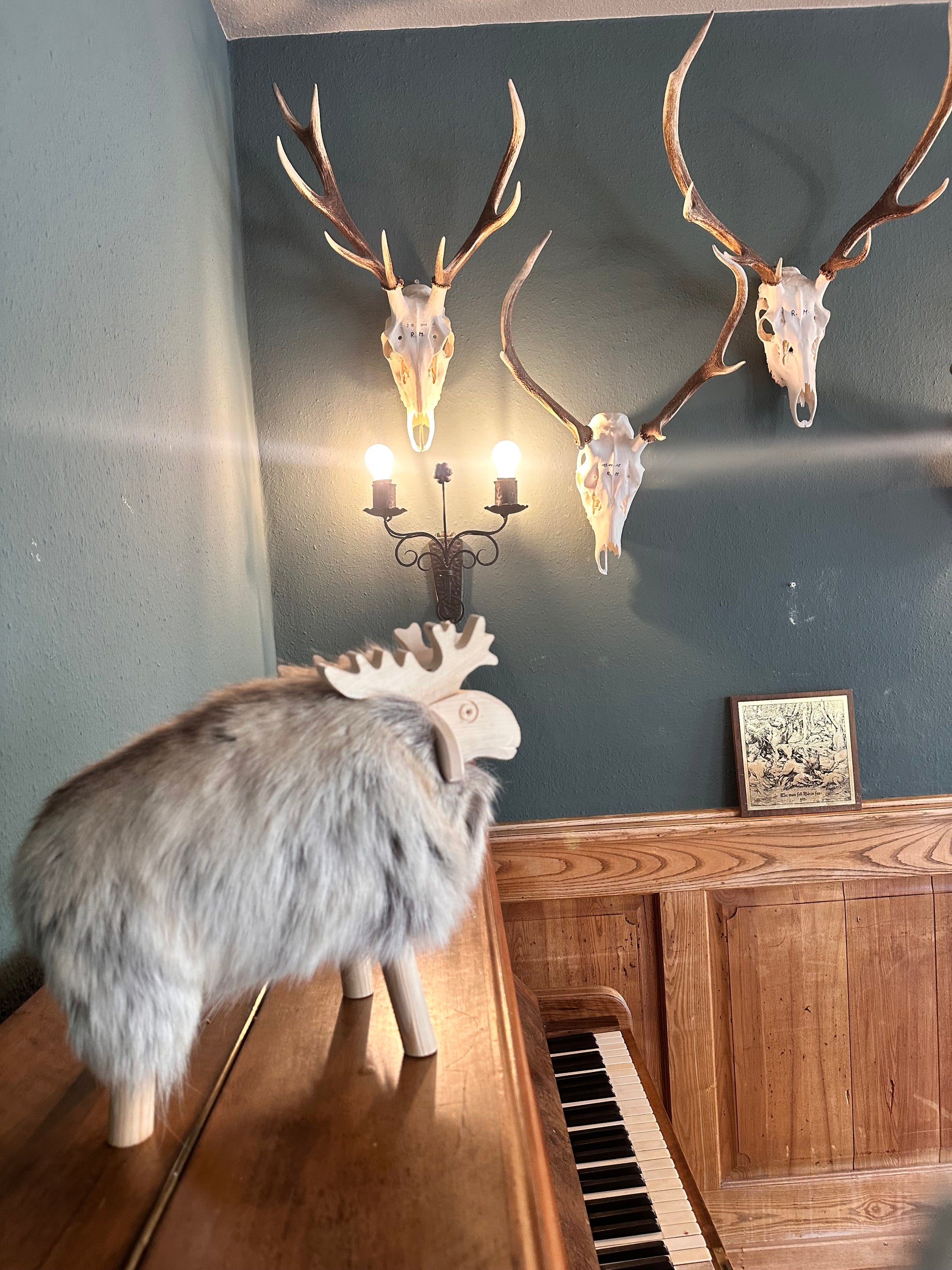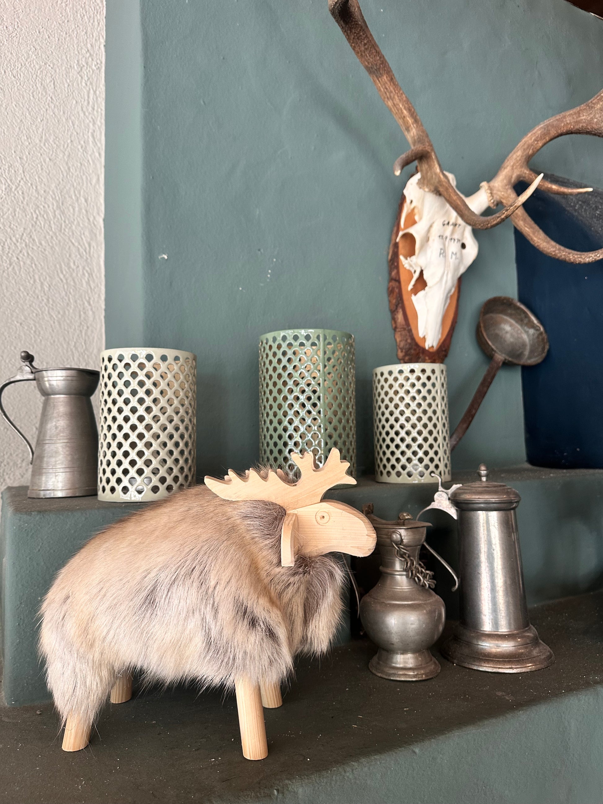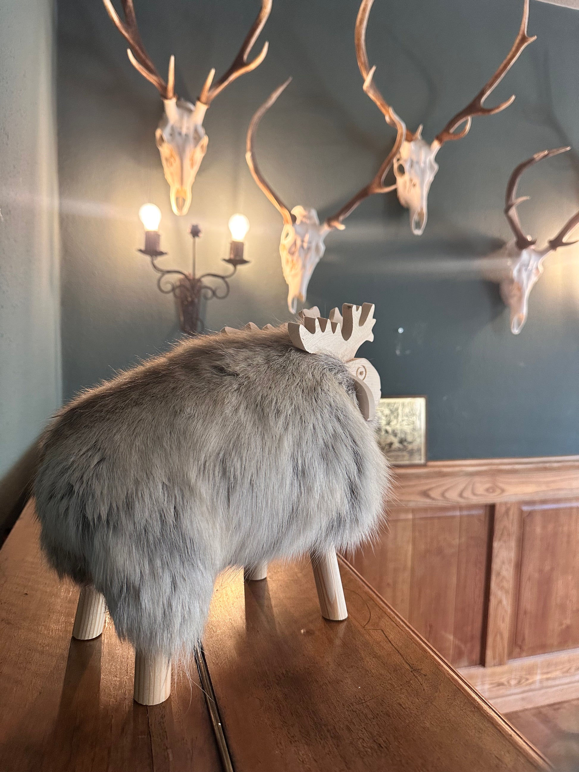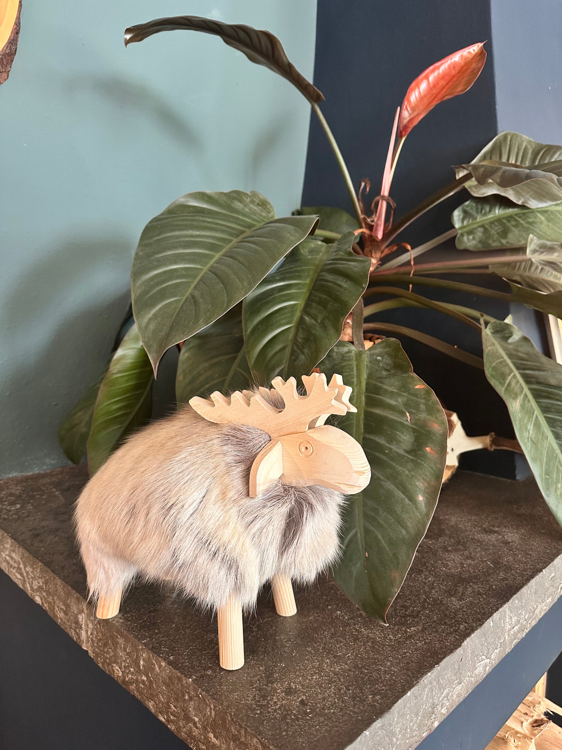 Holzhirsch Elch mit echtem Fell und Fichtenholz nordische skandi Boho Deko handmade