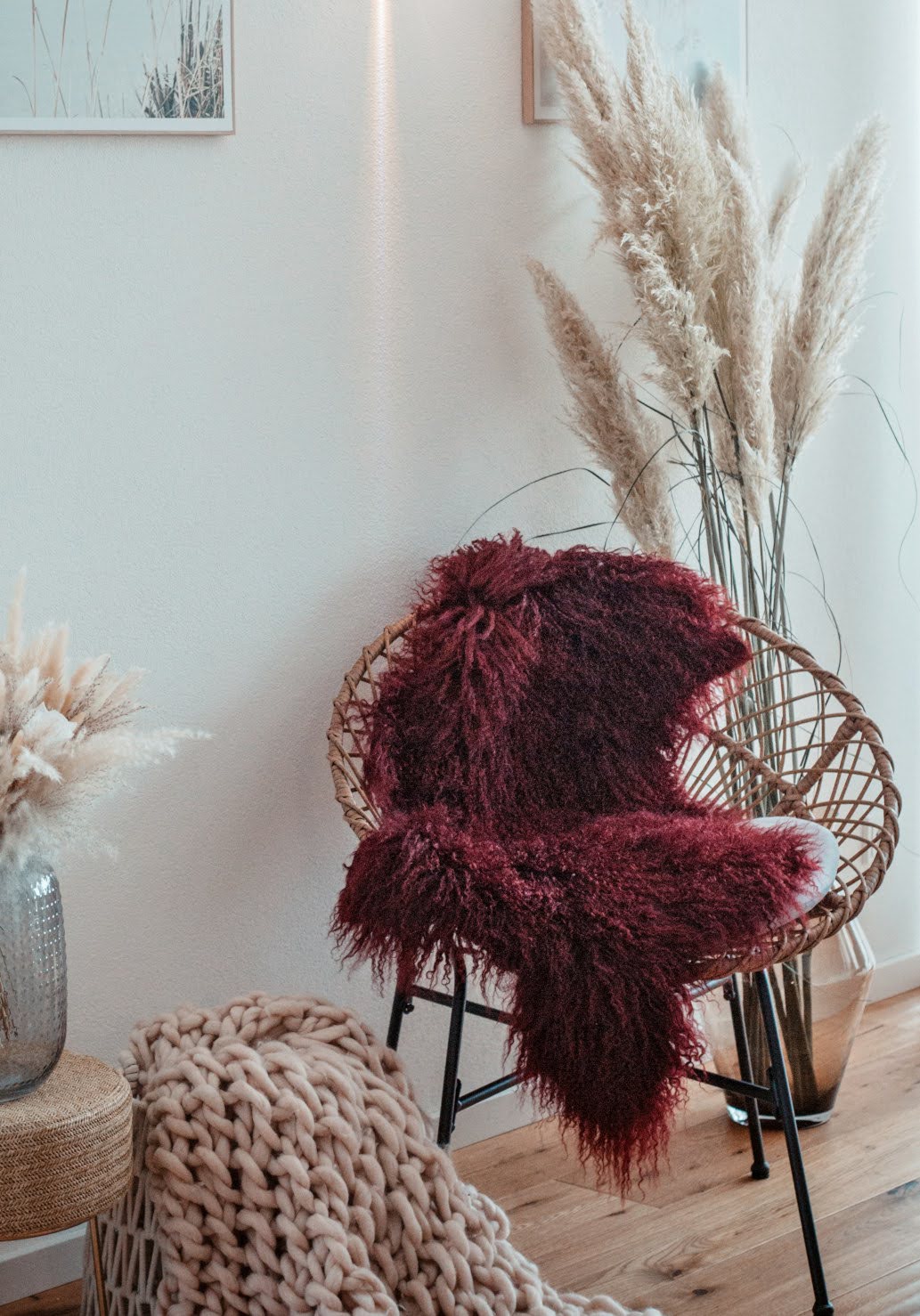 Tibetische Lammfelle mit feinen Locken sind wahre Blickfänge auf Sesseln oder Sofas.