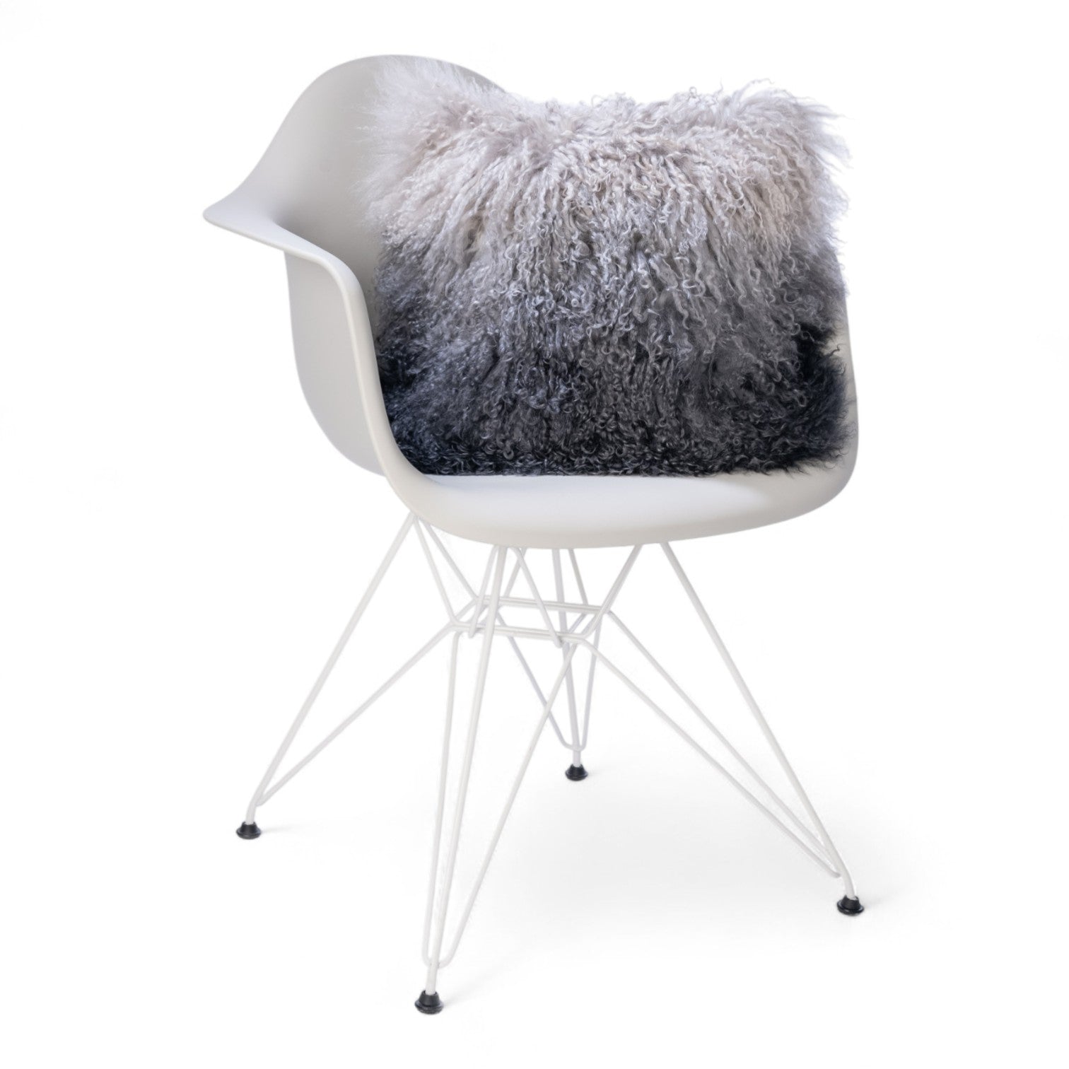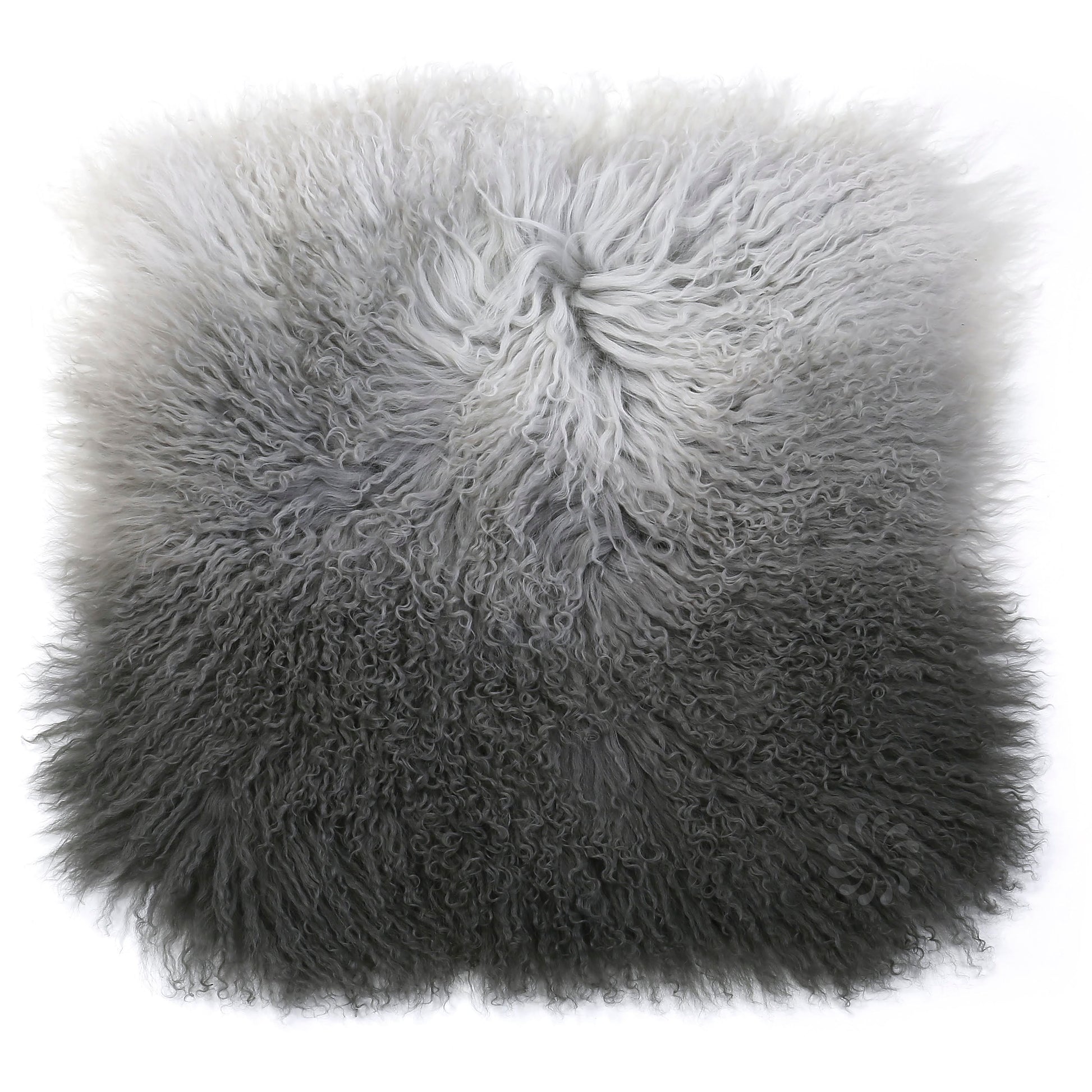 Das Kissen besteht aus 100 % gelocktem mongolischem Lammfell mit langem Flor, das für seine Flauschigkeit und Weichheit bekannt ist. Die Rückseite ist aus samtigem Polyester gefertigt und verfügt über einen versteckten YKK Reißverschluss, der eine einfache Handhabung ermöglicht.